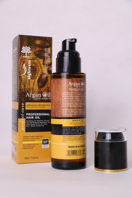 روغن آرگان لايتنس حاوى 95 درصد روغن آرگان طبيعى در تركيبات خود است. كه باعث نرمى و لطافت بافت مو شده و ساقه مورا تقويت مى كند. روغن آرگان از خواص فوق العاده اى برخوردار است از جمله اينكه، باعث درخشان شدن و شادابى بافت مو مى شود. وزى و خشكى را از بين برده واز ايجاد موخوره وشكنندگى نيز جلوگيرى ميكند.